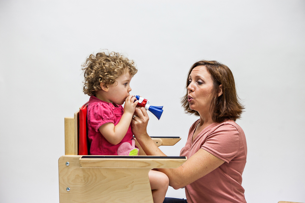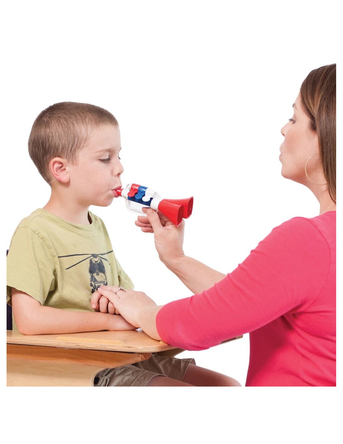 Soffiando nella trombetta, il bambino produce una cascata di bolle di sapone, migliorando la forza espiratoria, la coordinazione oro-facciale e la chiusura labiale in modo naturale e piacevole.