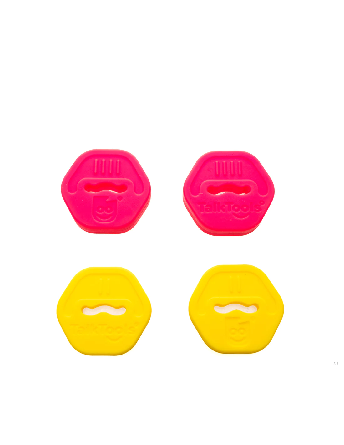 Ark proButton è uno strumento professionale divertente e coinvolgente che ti permette di lavorare sulla chiusura e la forza delle labbra, abilità fondamentali per un corretto sviluppo del linguaggio e dell'alimentazione. Ogni proButton ha due estremità a forma di bottone.