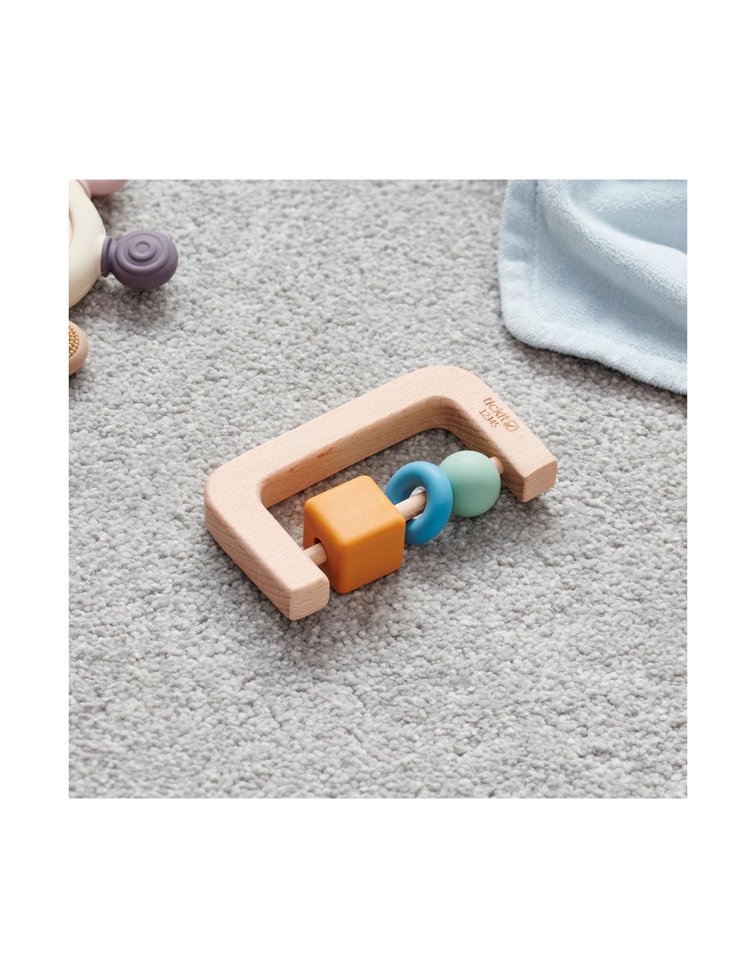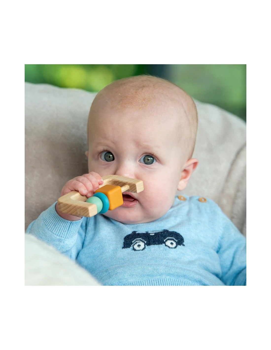 Il silicone con texture aiuta a lenire le gengive durante la dentizione, mentre il sonaglio in legno centrale produce un suono delicato che cattura l’attenzione del bambino, incoraggiando la coordinazione mano-occhio e l’esplorazione uditiva.