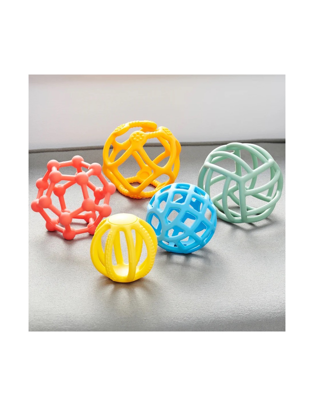 Ogni pallina presenta texture differenti, creste, rilievi e motivi tattili che invitano il bambino a esplorare con mani e dita.