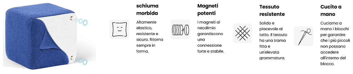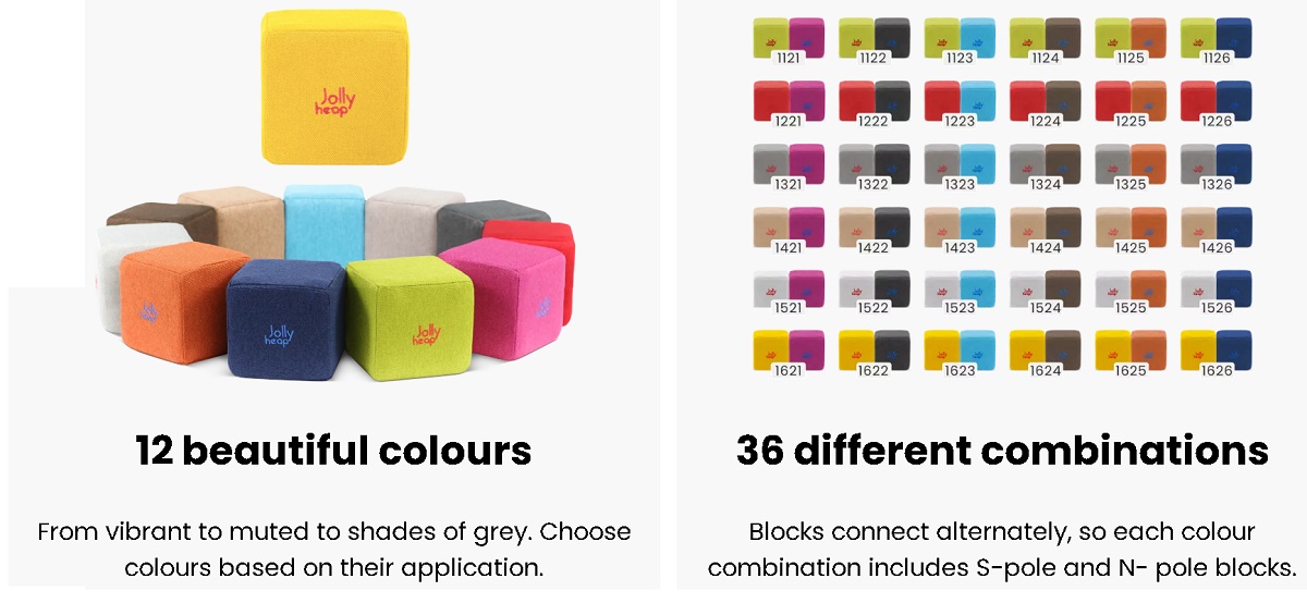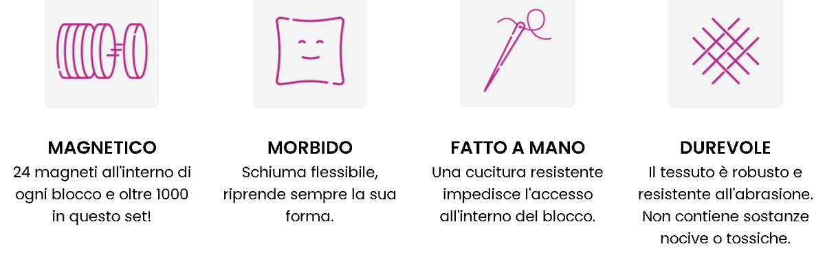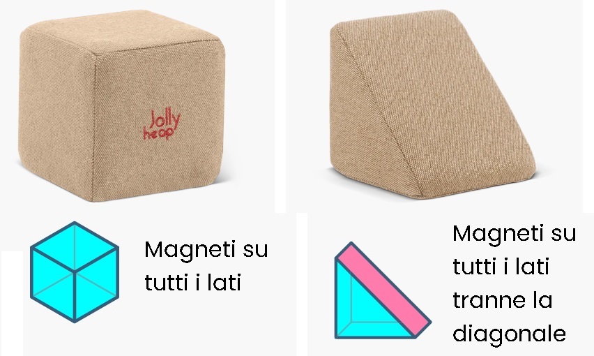 Il Set Base JollyHeap è composto da blocchi morbidi magnetici che permettono di costruire strutture tridimensionali in modo facile e sicuro. Grazie ai magneti interni brevettati, i blocchi si attraggono in qualsiasi direzione, stimolando la creatività, la motricità fine e la collaborazione tra bambini e adulti.