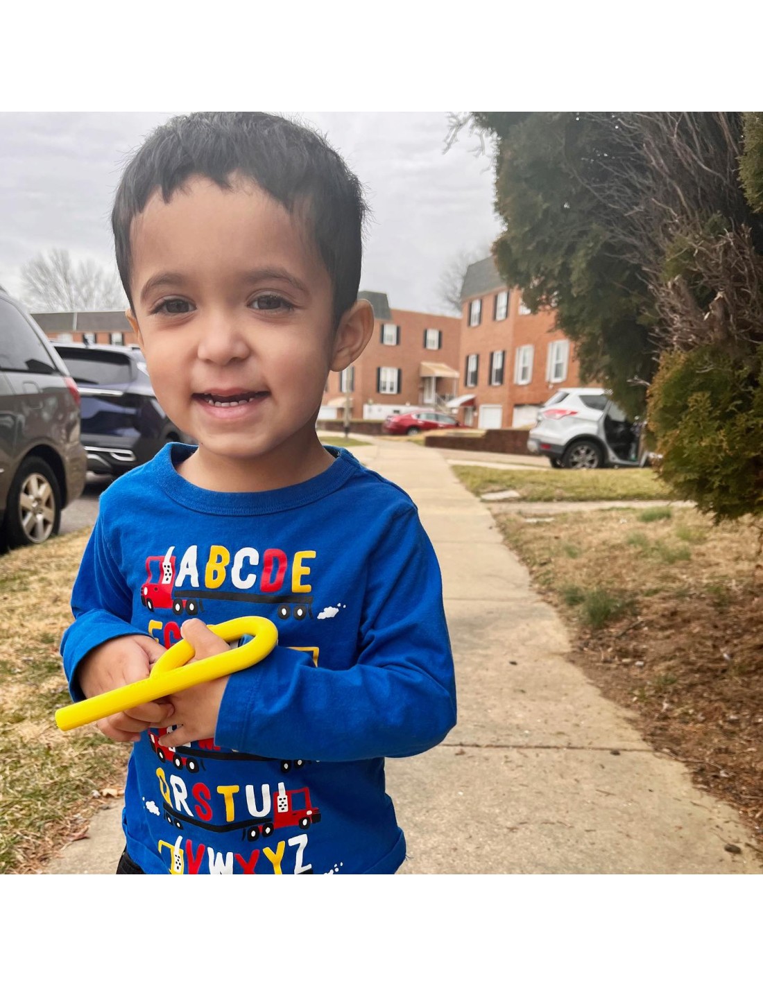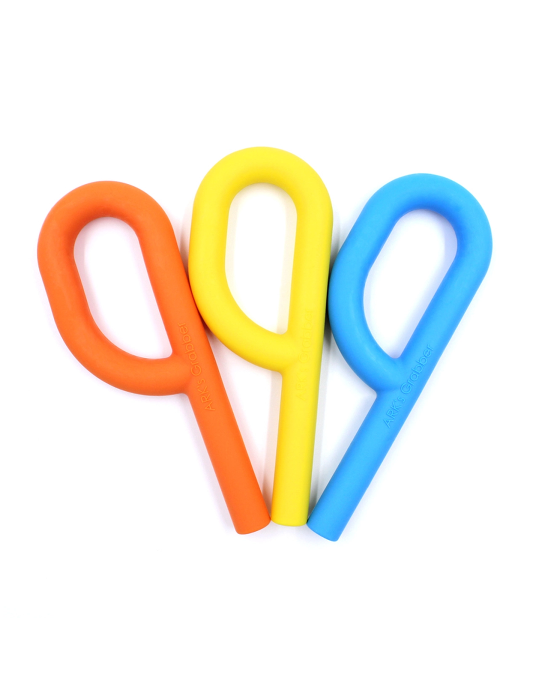 Il Masticabile Ark Grabber Sensory Tubolare® è disponibile in arancione (consistenza dura), blu (consistenza media) e giallo (consistenza morbida).