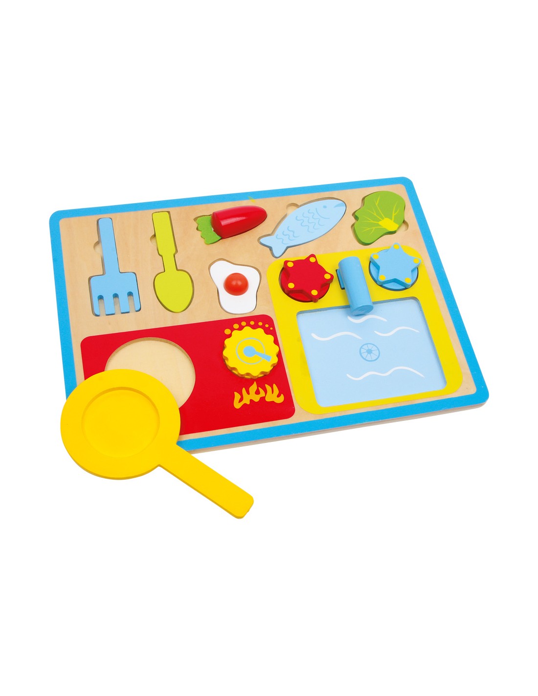 Le tessere illustrate rappresentano frutta, verdura, piante e animali della foresta e devono essere inserite correttamente negli appositi intagli sulla scatola. Il bambino è stimolato a riconoscere forme, colori e categorie, allenando così osservazione e logica.