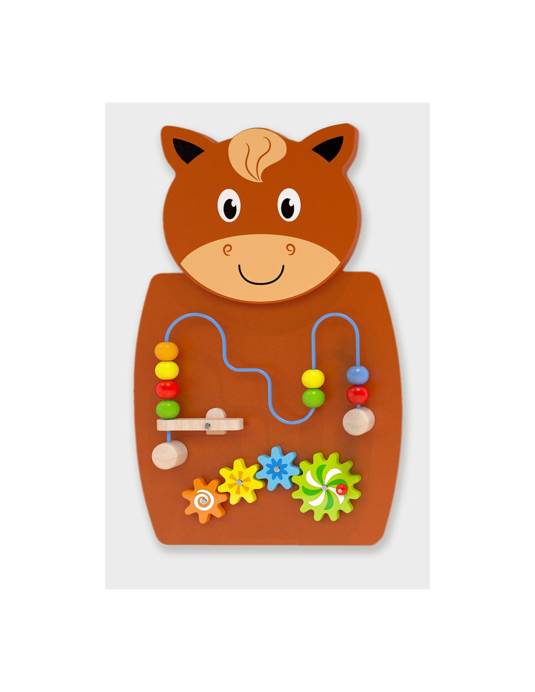 Gioco da parete con attività in legno, diviso in cinque sezioni, ciascuna con una serie diversa di attività manipolative per incoraggiare la coordinazione occhio-mano e le capacità motorie, tra cui occhi rotanti, dischi rotanti, ruota dei colori primari, serrature e fermi e un puzzle con ingranaggi ad incastro. Ideali per il gioco individuale o collaborativo.