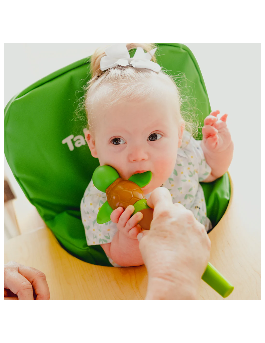 Dentaruolo con impugnatura antiscivolo ed ergonomica, consigliato dai specialisti per bambini dai 6 mesi utile per massaggiare con una delicata vibrazione le gengive e alleviare la pressione della dentizione.