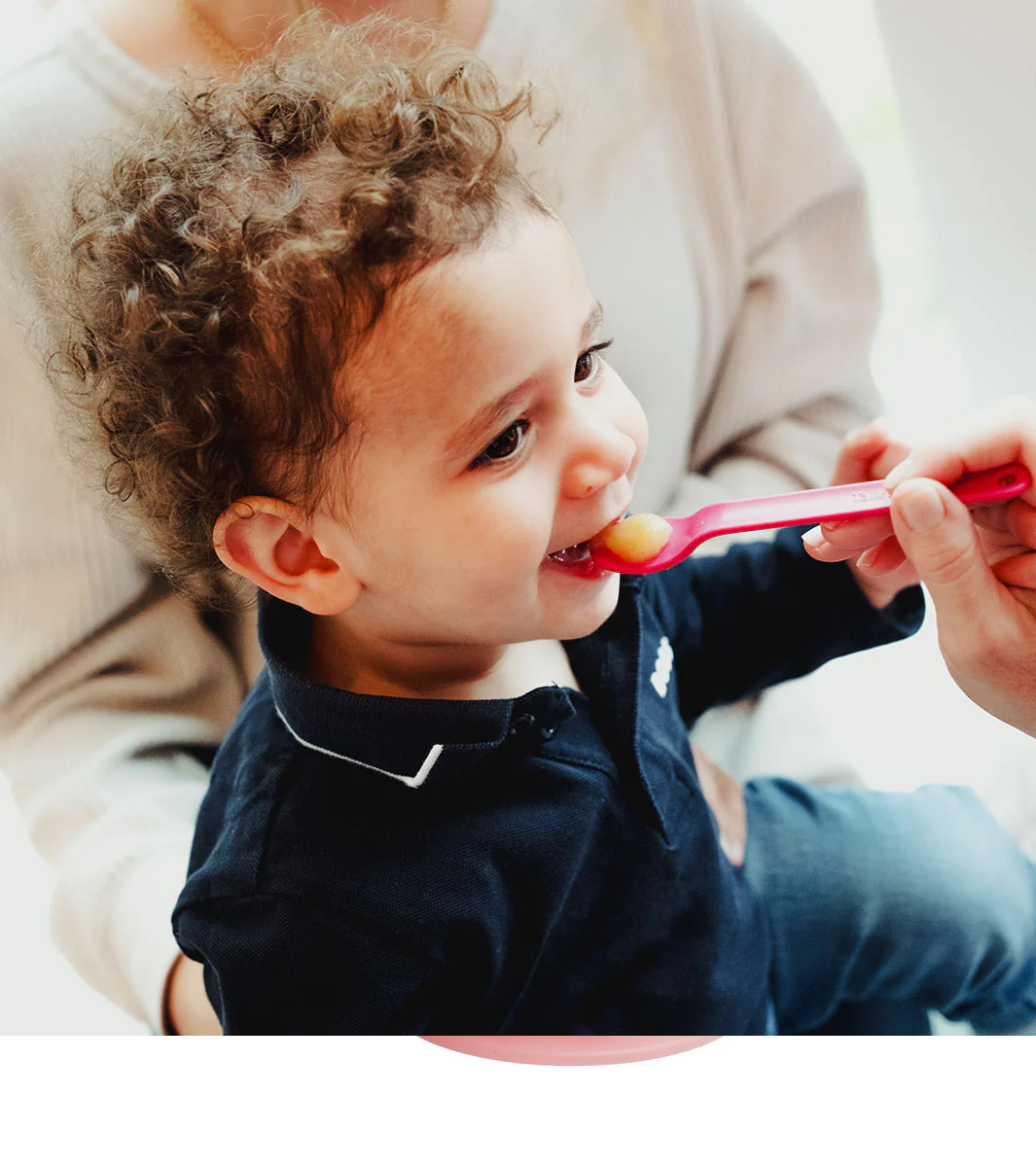 Il design ad anello ergonomico permette una presa facilitata con una o entrambe le mani, favorendo stabilità e controllo durante l’introduzione del cibo.