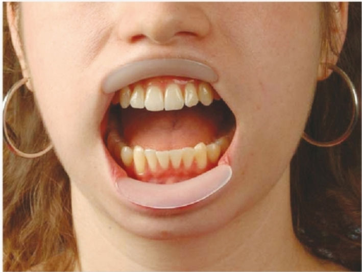 Elemento di plastica resistente e sterilizzabile di forma circolare che permette di separare la muscolatura labiale per favorire l’indagine o per scattare foto dell’occlusione.